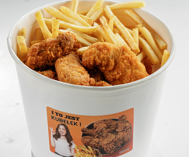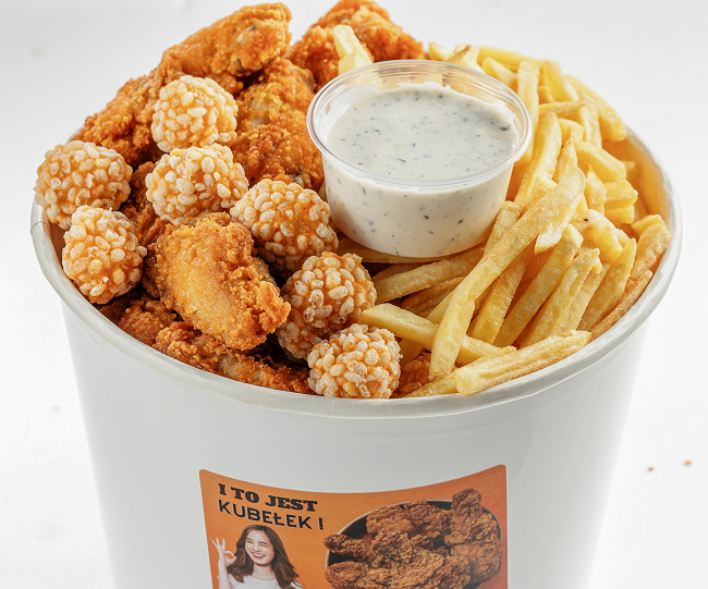 12 skrzydełek, 2 strips, 10 pops, 3 x frytki 100 g, sos czosnkowy